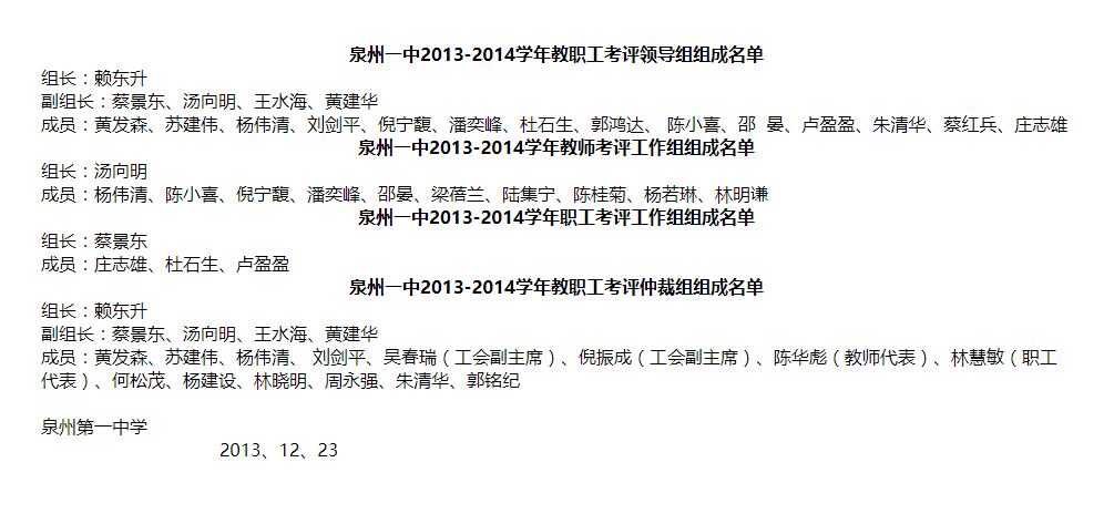 泉州一中2013-2014学年教职工考评领导组、工作组组成名单