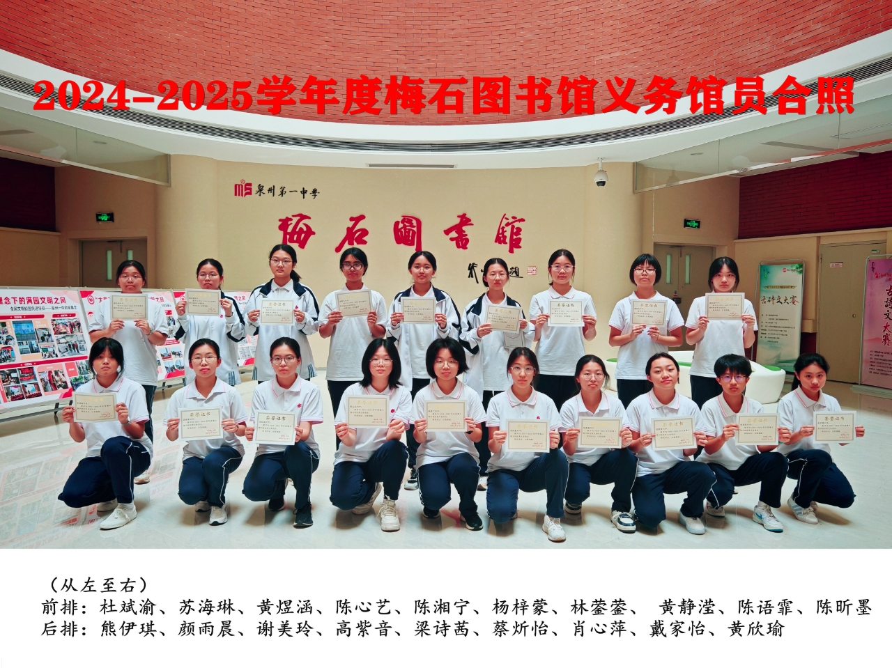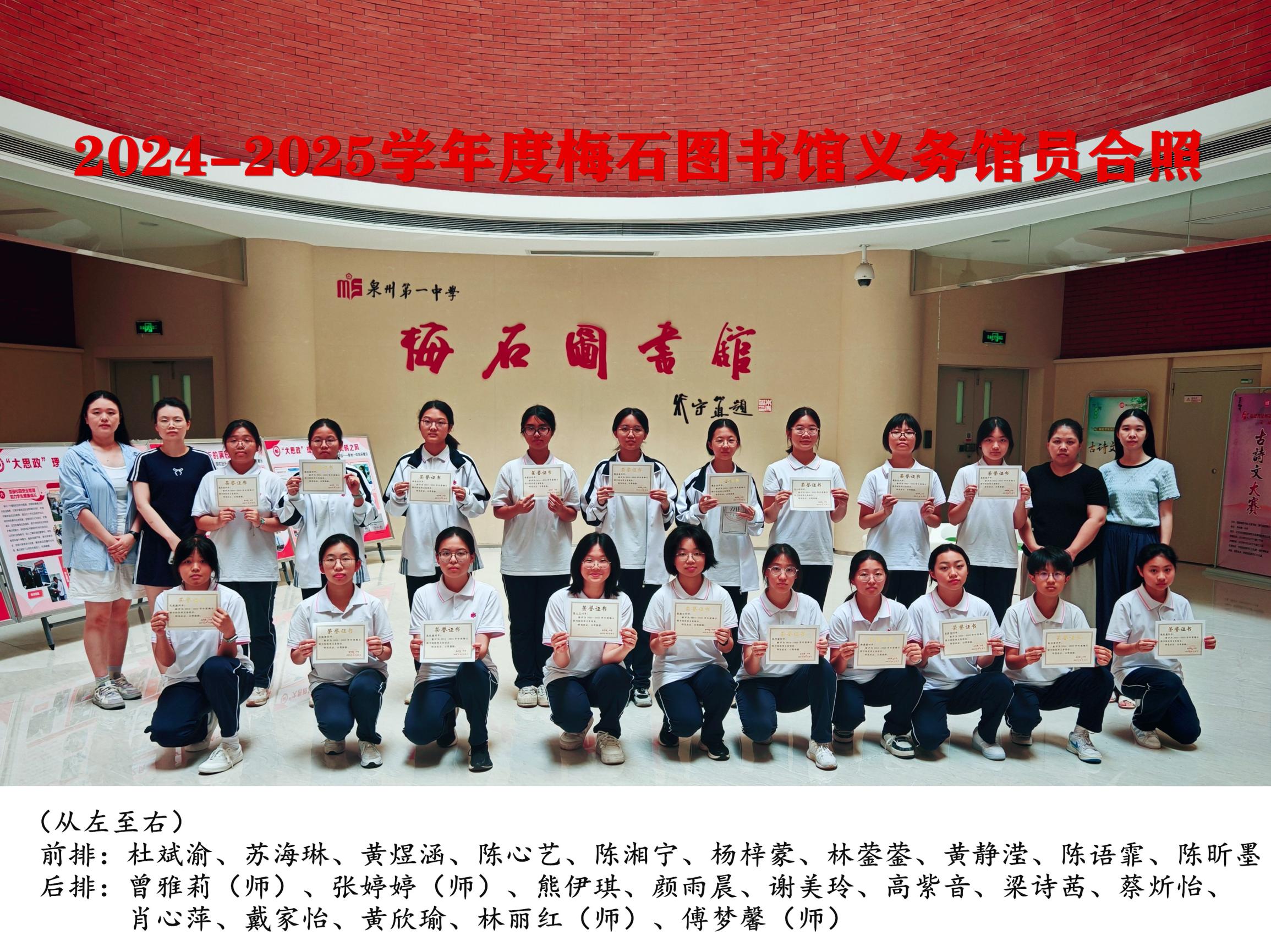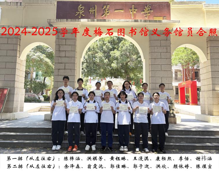 2024-2025学年度泉州一中梅石图书馆优秀义务馆员合影