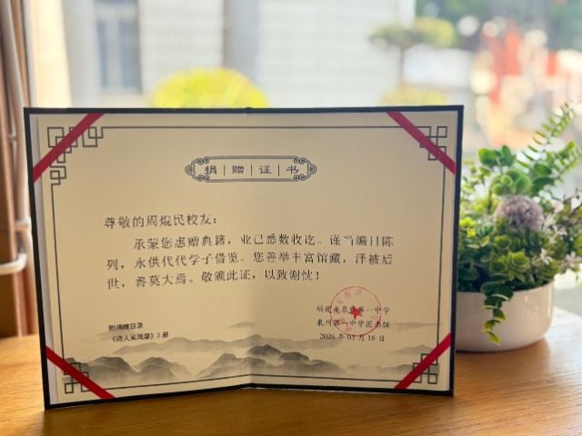 2026年3月17日,泉州市人民政府原副市长、泉州一中1963届高中校友周焜民先生向我校梅石图书馆捐赠图书《诗人 吴凤章》 2册, 《诗人 吴凤章》是“厦门文学艺术人物系列专辑”中的一册,由中国文史出版社出版,厦门市文学艺术界联合会编纂。这本书生动呈现了吴凤章先生作为厦门文艺界代表人物的创作历程与艺术风采。