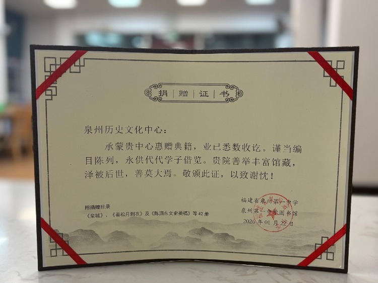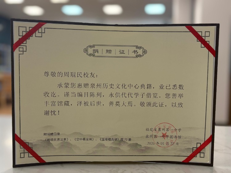 2026年1月22日,泉州市人民政府原副市长、泉州一中1963届高中校友周焜民先生向我校梅石图书馆捐赠个人珍藏图书72册,内容涵盖泉州人文历史、山川地貌等,其中包括《泉州太祖拳》《泉州书法史略》《温陵稽古录》《陈祥耀文史类稿》等具有重要地域特色与学术价值的著作,此批赠书收藏于学府校区图书馆, 为广大师生深入研习泉州历史文化、传承中华优秀传统文化提供有力支持。
